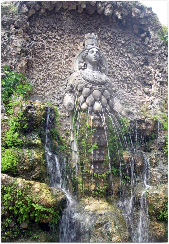 La Fontaine de Diane d’Éphèse (ou Fontaine de la Nature) : Située à l’origine au centre de l’allée des Cent Fontaines avant d’être déplacée, cette statue surprenante représente la déesse avec de multiples seins, symbolisant la fertilité et la Nature nourricière. C’est l’une des images les plus célèbres du jardin, rappelant le lien entre l’antiquité païenne et la philosophie de la Renaissance